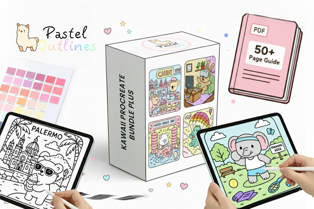 Over 140 ready-to-color illustrations (in printable PDF and transparent PNG perfect for Procreate), 34 exclusive brushes, more than 30 pre-made color palettes, and a 50+ page PDF guide covering everything from the basics to advanced techniques. All in premium 300 DPI quality for flawless results on screen and on paper. And that’s not all: you’ll also get free monthly updates for an endless source of inspiration!