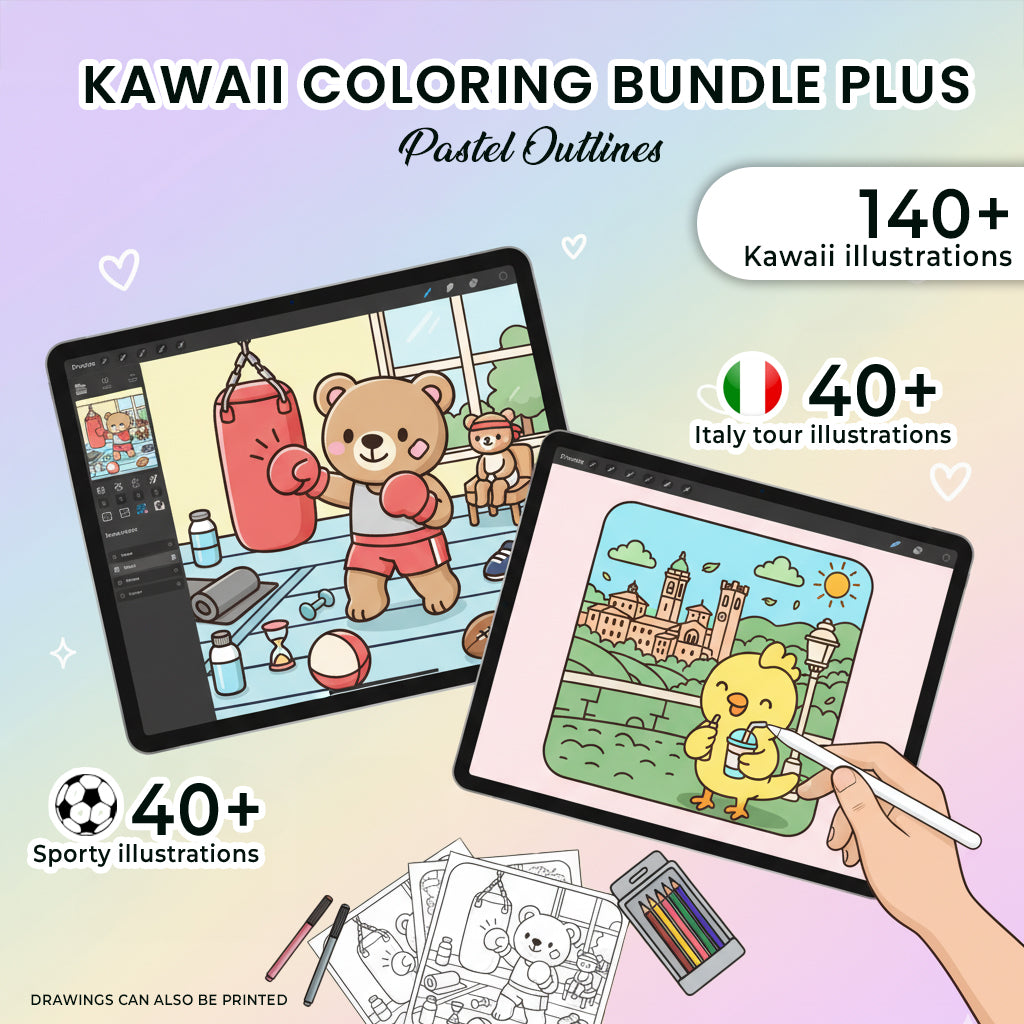 Over 140 original kawaii illustrations ready to color, plus 40+ sports-themed designs and 40+ inspired by Italy’s most iconic places. All available in high-quality printable PDF and transparent PNG (300 DPI), perfect for both printing and digital use. A complete set that brings you creativity, relaxation, and fun wherever you choose to color! And that’s not all: you’ll also get free monthly updates for an endless source of inspiration!