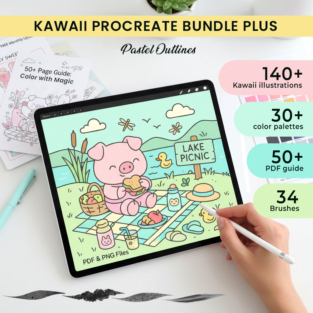 Over 140 ready-to-color illustrations (in printable PDF and transparent PNG perfect for Procreate), 34 exclusive brushes, more than 30 pre-made color palettes, and a 50+ page PDF guide covering everything from the basics to advanced techniques. All in premium 300 DPI quality for flawless results on screen and on paper. And that’s not all: you’ll also get free monthly updates for an endless source of inspiration!